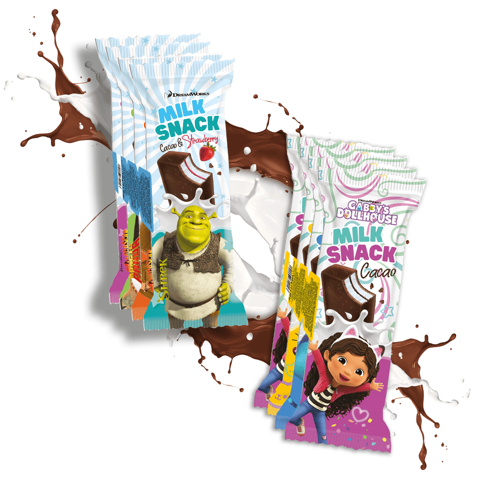 Der Milk Snack Choco unter der Lizenz von Universal begeistert mit halbjährlich wechselnden Designs – jetzt im farbenfrohen TROLLS Look mit Poppy, Branch und weiteren Charakteren.